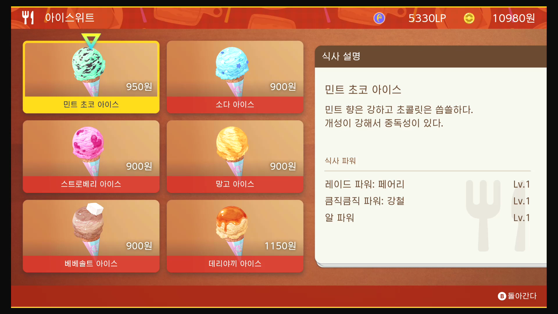 다시 마을로 오면 아이스크림 파는곳이 있는데 종류마다 식사파워가 다르다.