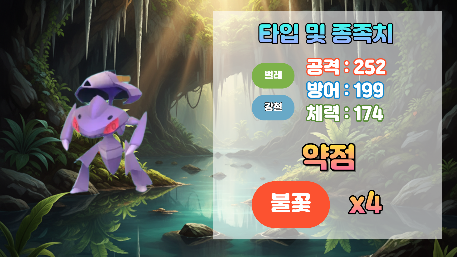 공격은 252로 준수한편이고 방어는 199 체력은 174로 전설,환상급 포켓몬에겐 아쉬운 수치입니다.